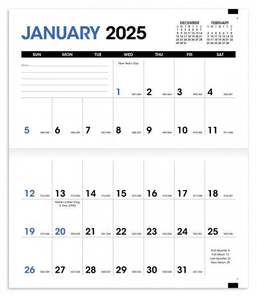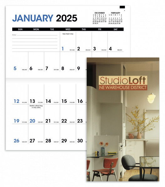 Based on a custom paper cover added to a stock grid pulled from inventory; stapled binding; month-at-a-glance, horizontal date grid format.