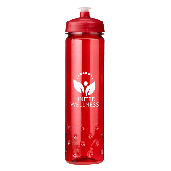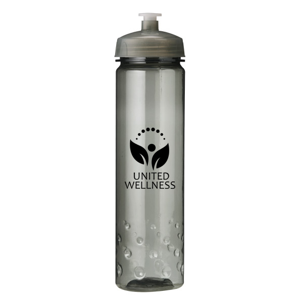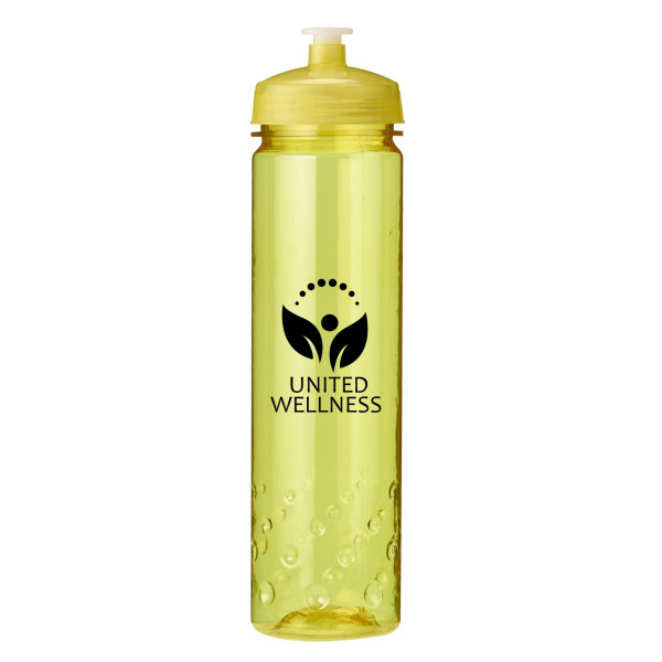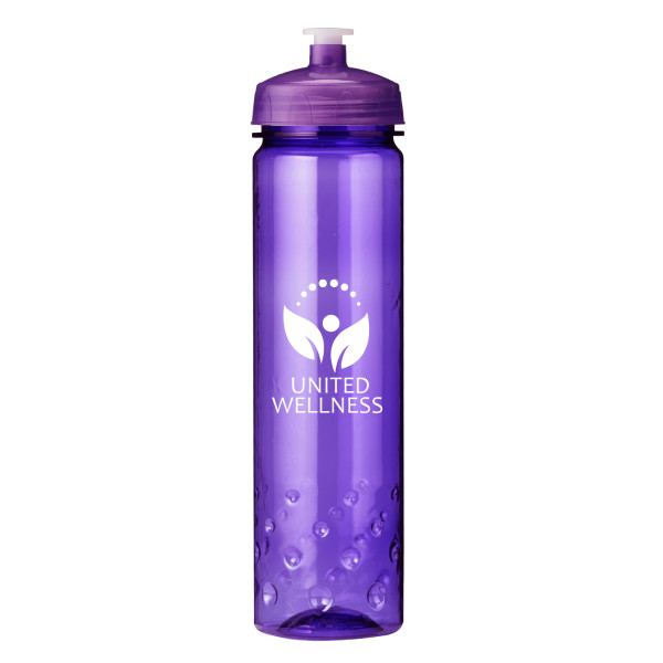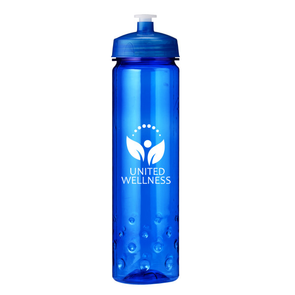 The Food Grade PET bottle features a distinct thin Euro body with a bubble design on bottom. Easily add ice cubes with the wide mouth design. They feature a matching colored leak-resistant push-pull lid. The PolySure Inspire Bottle comes in a lustrous, high-gloss finish, and will fit most auto cup holders. Hand wash only.::24 oz.::Made in the U.S.A.
