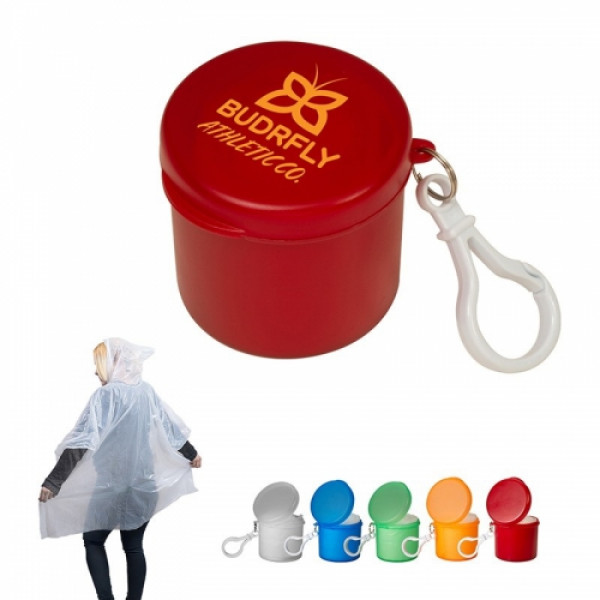 ::Disposable clear PE Plastic hooded poncho in PP Plastic case ::One size fits most adults. ::Case includes plastic carabiner to attach to bags and beltloops.::NOTE: Poncho is disposable and meant for one-time use. Case may be reused after poncho disposal.