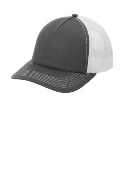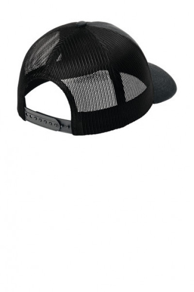 - 100% cotton twill front panels and bill (Solids), 65/35 polyester/cotton twill (Heather Grey), 100% polyester mesh back panels