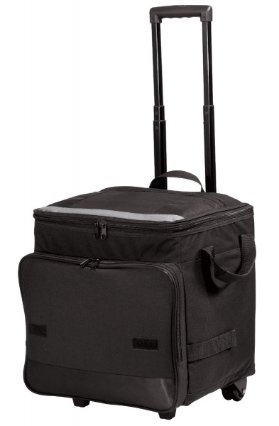 600 denier polyester canvas, 420 dobby polyester, PEVA lining Zippered main compartment Zippered front pocket Easy-to-clean, heat-sealed, water resistant lining Removable bottom board Web top and side handles One-hand push button extension handle; extends to 21" Smooth, durable inline skate wheels Dimensions: 14"h x 14"w x 11"d (expanded); 14"h x 14"w x 7"d (collapsed); Approx. 2,156 cubic inches (expanded)Details