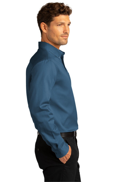 4.3-ounce, 55/45 cotton/poly twill Stain release Wrinkle-resistant Easy Care Button-down collar Dyed-to-match buttons Left chest pocket Rounded adjustable cuffs Back yoke with box pleatDetails