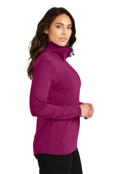 6.8-ounce, 90/10 poly/spandex fleece Moisture-wicking Dyed-to-match molded zipper Cadet collar with seaming Forward shoulder Front seams with integrated pockets Dyed-to-match zippered pockets Back waist seaming Slightly curved, drop tail hemDetails