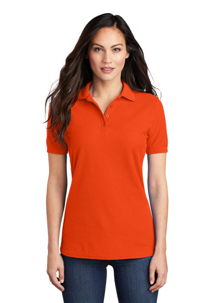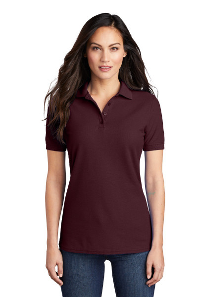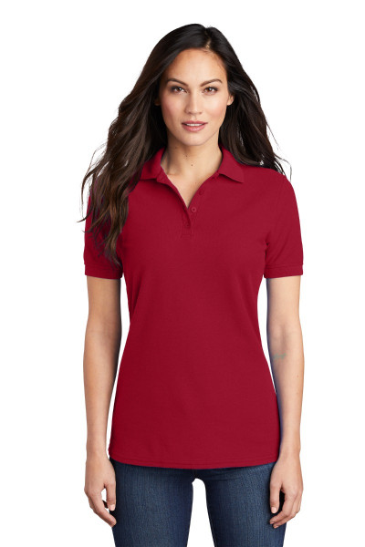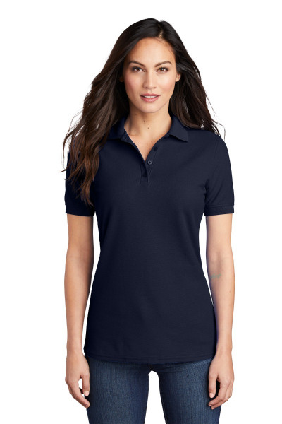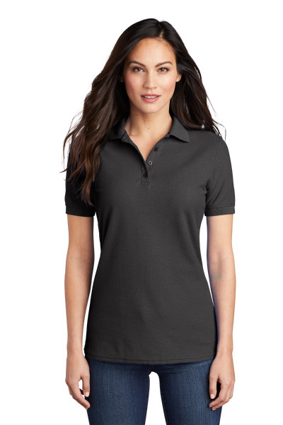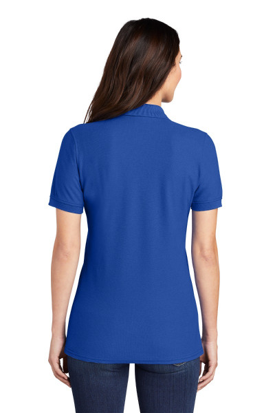 6.5-ounce, 50/50 double pique knit cotton/poly Stain-release finish Contoured body for a feminine fit 1x1 rib knit collar and cuffs 4-button placket with dyed-to-match buttons Coverstitched shoulders, armholes and cuffs Side seamed Double-needle hemDetails