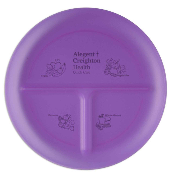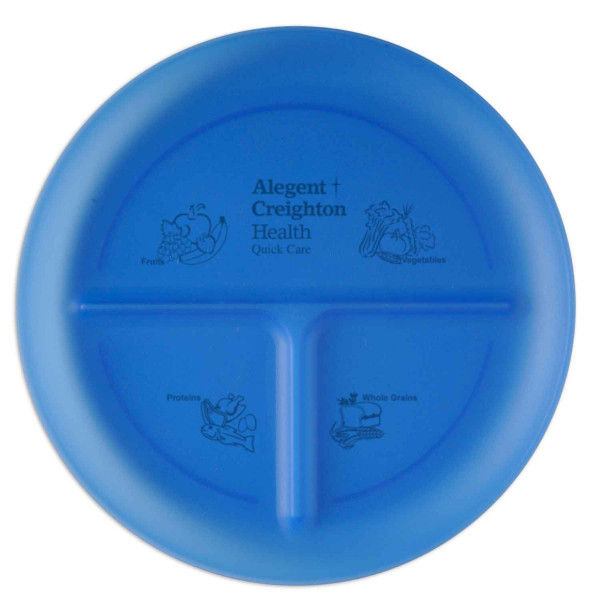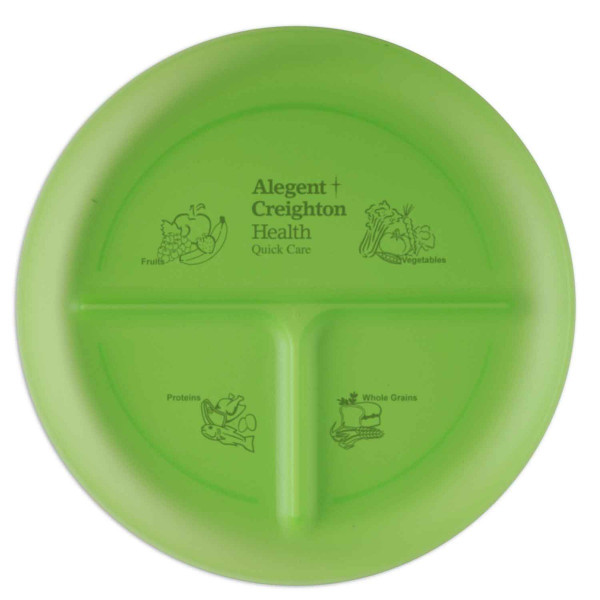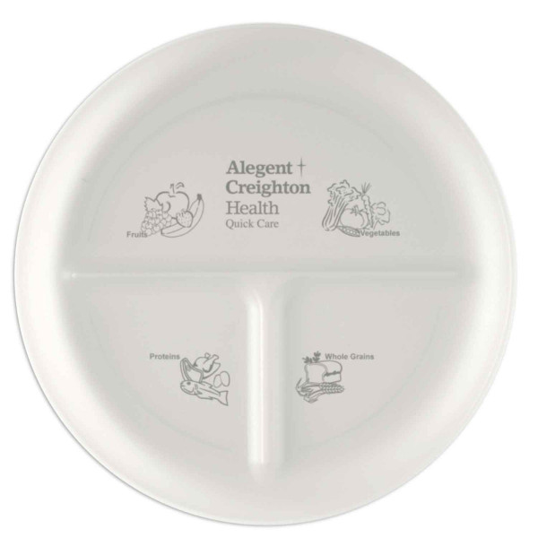 This durable Food Grade Polypropylene plate has three compartments to help with portion control - the large half is recommended for fruits and vegetables, and two smaller quarters for grains/starches and meats/proteins. It reinforces balanced eating and a healthy diet. Ideal for weight conscious clientele & wellness programs. ::Top rack dishwasher safe.::Imprint on back side only.::Made in the USA.
