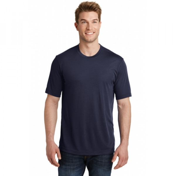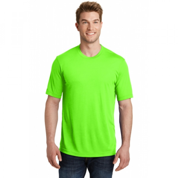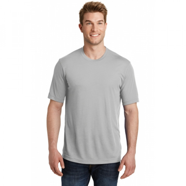 A soft cotton hand merges with color-locking, moisture-wicking performance in this tee that also has a matte finish.::4.7-ounce, 100% spun polyester jersey with PosiCharge technology::Soft cotton hand::Removable tag for comfort and relabeling::Dyed-to-match neck taping::Set-in sleeves