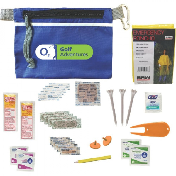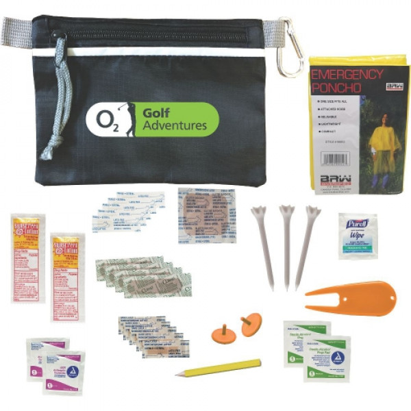 ::Full of practical golfers must haves ::Kit includes: 2 Sunscreen Packets, 1 Divot Tool, 1 Golf Pencil, 3 Performance Golf Tees, 2 Ball Markers, 1 Rain Poncho, 2 Sunscreen Packets 3.5g, 4 Bandages, 5 Junior Bandages, 5 Butterfly Bandages ::1 Antibacterial Wipe, 2 Antiseptic Wipes, 2 Alcohol Wipes