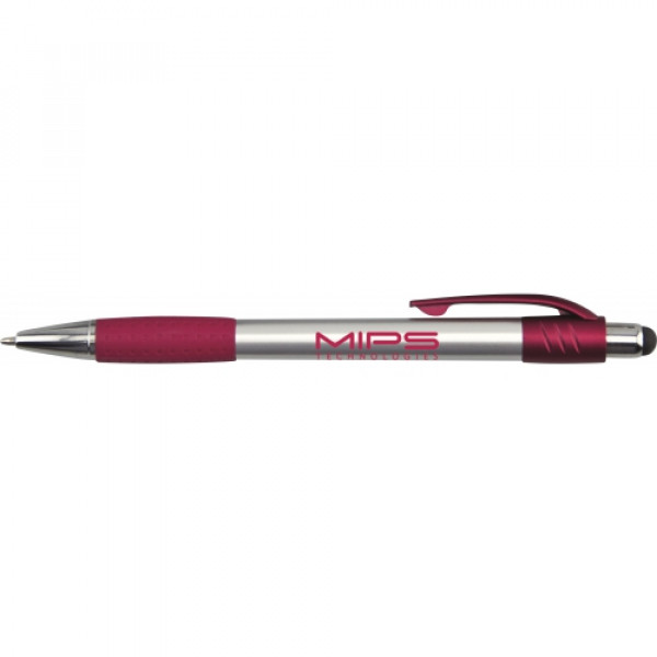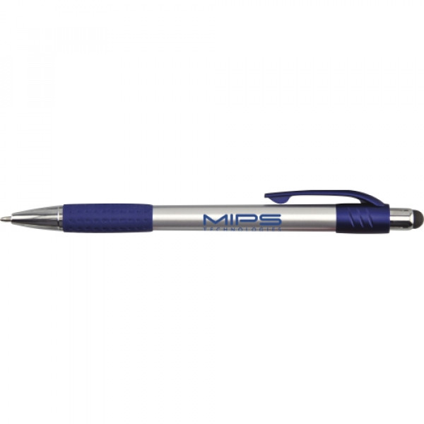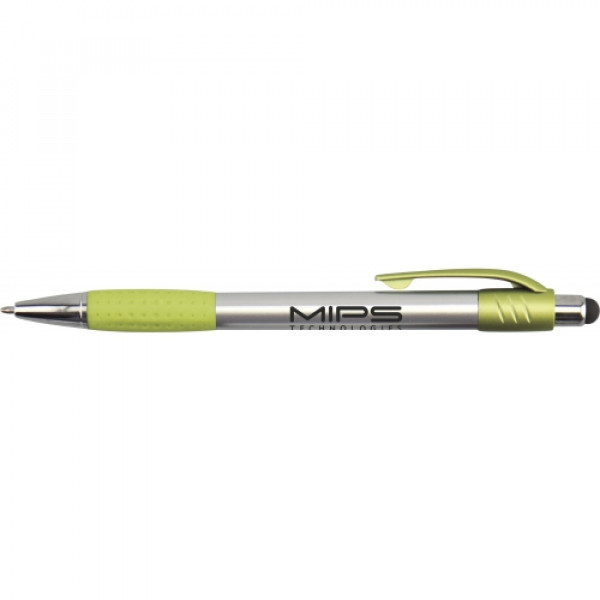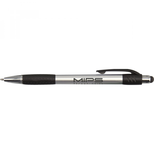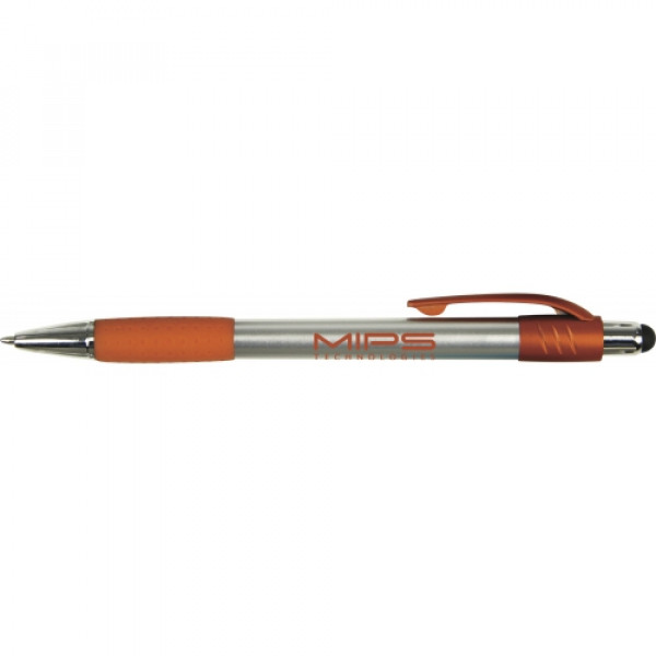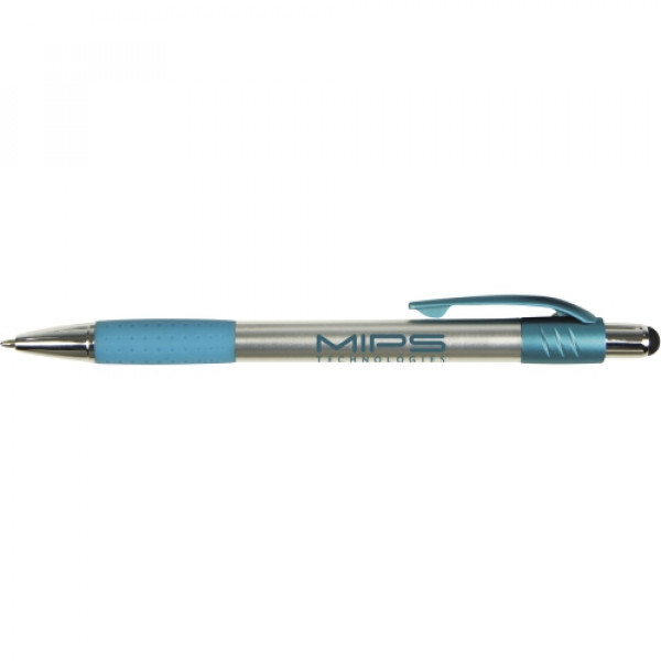 ::Capacitive stylus plunger that works with iPad, iPhone, Android and other touchscreen devices::Smooth, matte, metal-tone barrel::Matching colorful gripper and clip::Soft, dimpled, rubber gripper