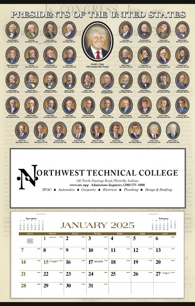 With photos of past Presidents, this historical hanger is a keepsake. A large ad area creates a calendar that is welcome on any wall.