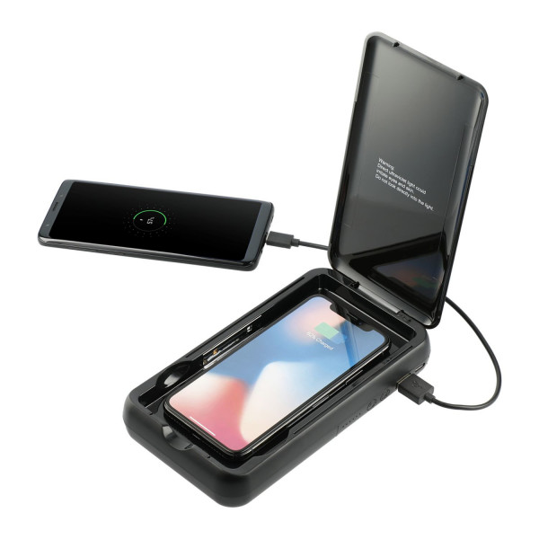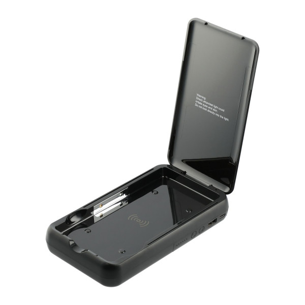 - Functions as a wireless phone charger, power bank, and personal sanitization system.