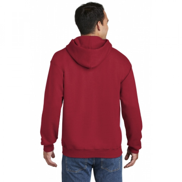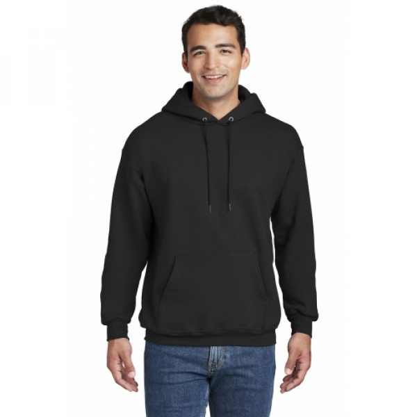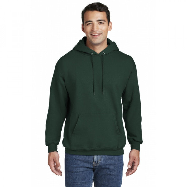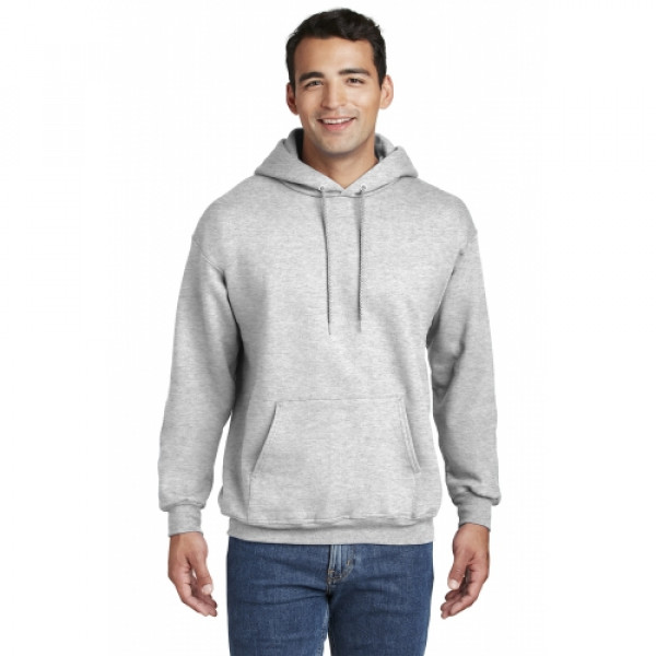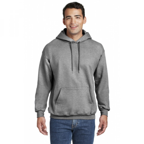 10-ounce 90/10 cotton/poly PrintPro XP low pill high-stitch density fabric; 100% cotton face Two-ply hood with grommets and dyed-to-match drawcord Set-in sleeves Coverseamed armholes and waistband Spandex in cuffs and waistband Front pouch pocket Hanes EasyColor program haneseasycolor.comAsh and Light Steel are 85/15 cotton/poly.