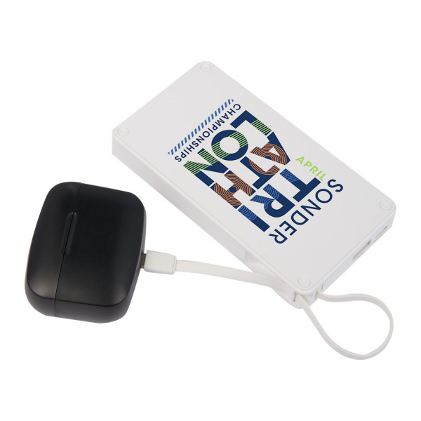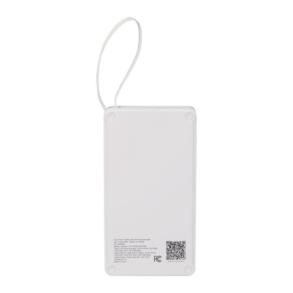 The Pure Power 10,000 mAh 35W PD Power Bank has a 10,000 mAh/37Wh rechargeable lithium battery with one Type-C Input/Output port of 35W and one USB-A Output Port of 20W. It also includes an integrated cable with Type-C tip that can be both input and output at 35W charging speed. The power bank itself can be recharged through integrated cable or your own Type-C cable. Type-C Port & Tip: 5V/3A, 9V/3A, 12V/2.92A, 15V/2.33A, 20V/1.75A (35W max); USB-A Output: 5V/3A, 9V/2.22A, 12V/1.67A (20W max). It supports Apple and Samsung fast charging, Qualcomm Quick Charge, and USB-C Power Delivery for high-speed charging to virtually any Type-C device. Power banks are permitted in carry-on luggage only and at the discretion of TSA agents. Please charge the power bank before initial use.