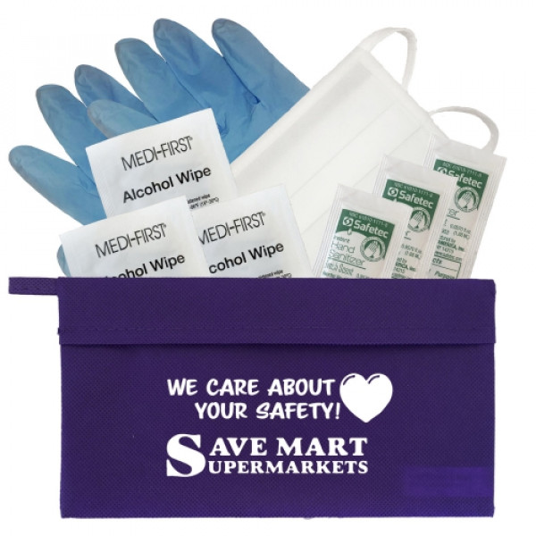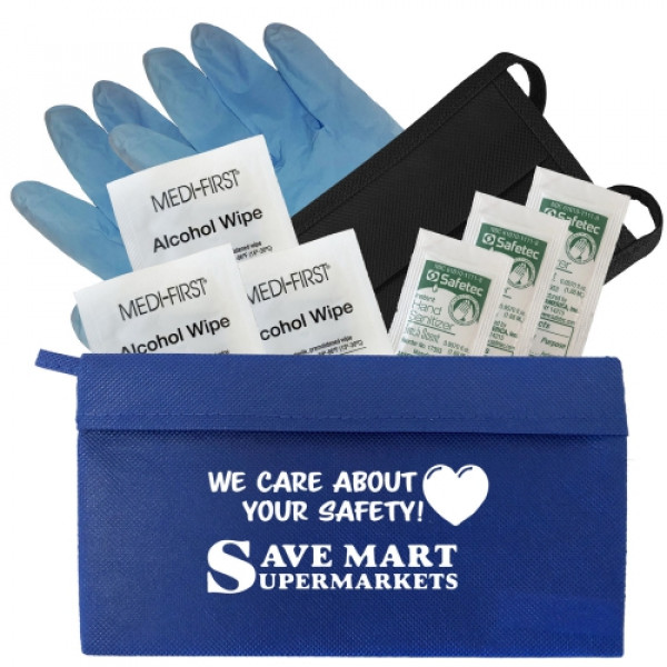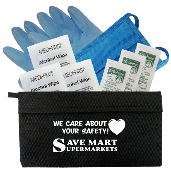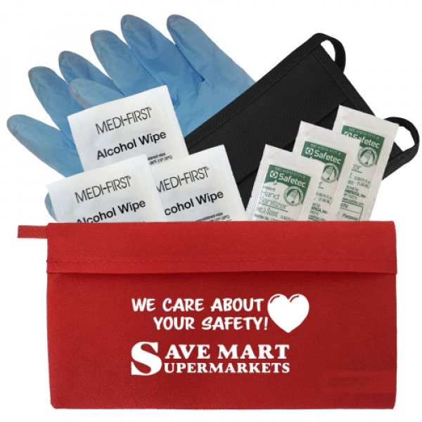 ::Large reusable 4.5" x 9" pouch constructed of 80 GSM non-woven polypropylene with hook and loop closure::Includes: 1 non-woven reusable face mask, 1 pair of Nitrile gloves, 3 hand sanitizer packets (66.5% ethyl alcohol) and 3 alcohol wipes (70% Isopropyl Alcohol)::Ideal for: healthcare and frontline workers, grocery and retail stores, hospitality industry, casinos, food service, schools, warehouses, banks, or any company wanting to reward team and customer loyalty