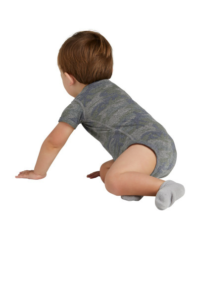 Soft and lightweight, this bodysuit has a heathered pattern in a variety of colors for a cool, casual look and retro feel. Lap shoulders make for easier changing.