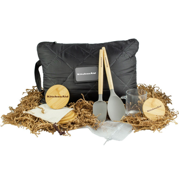Kit includes: Silicone Spoon, Silicone Spatula set; Drinkmat Set Of 4 Bamboo Coasters W/ Canvas Pouch; Snugbug 2-in-1 Pillow Blanket; 11oz Glass Mug/bamboo Lid
