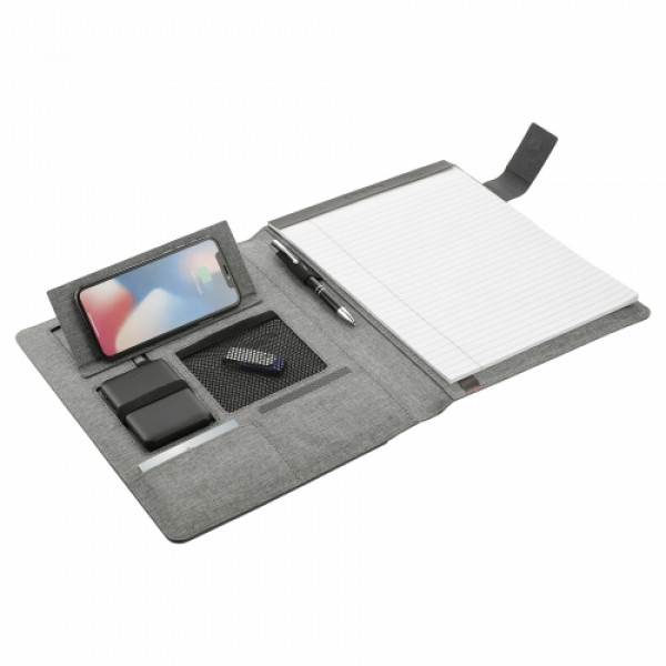 ::Packed with power allowing you to charge your smartphone without the cables. ::The removeable UL listed, 5000 mAh rechargeable powerbank supports wireless charging along side the pop charging stand at up to 1A for devices including but not limited to iPhone series, Samsung Galaxy Note. ::If want to charge an iPhone series before iPhone 8 with wireless technology, you will need to connect micro USB charging cable to Powerbank. ::Front pocket, interior mesh pocket, elastic pen loop and business card pockets. ::Magnetic closure. ::Includes 8.5" x 11" writing pad with 30 sheets of recycled lined paper. ::Includes FSC cardboard gift box, micro to USB cable and instruction manual.::Through a partnership with 1% For The Planet, one percent of sales of this and all EcoSmart products will be donated to nonprofits dedicated to protecting the planet.