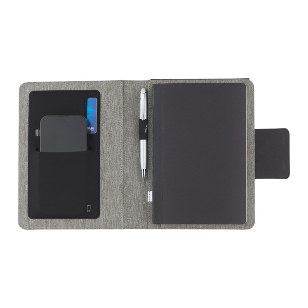 The Reclaim RPET MagClick Fast Wireless Journal is made of post-consumer recycled fabrics. This specialty bound notebook features a RPET cover with recycled leather front pocket for storing documents, smartphones, and other essentials. This notebook includes 64 sheets of FSC® recycled lined paper. Also includes 15W wireless charger with magnet, 1m TPE charging cable and interior elastic pen loop. Through a partnership with 1% For The Planet, one percent of sales of all EcoSmart® products are donated to environmental nonprofits.
