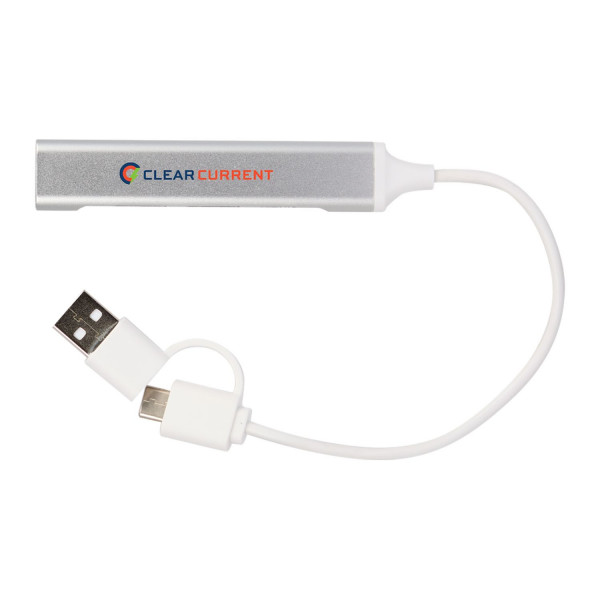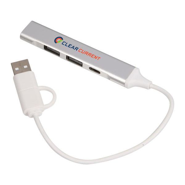- he Recycled Aluminum 4-Port USB-A and C Hub features dual input USB-A and Type-C tips, USB-A three USB-A outputs ports, and one Type-C output port, making it compatible with computers and other electronic devices, like mouse, flash drives, keyboard and more. The cable length 7.67-inches.The case is made of 100% recycled materials. By choosing this product, you're also supporting environmental nonprofits through our partnership with 1% For The Planet..