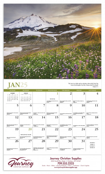 Find serenity with this calendar that combines King James Bible verses with inspirational scenic images. The FSC® label means that the materials used for this product come from well-managed FSC®-certified forests and other controlled sources.