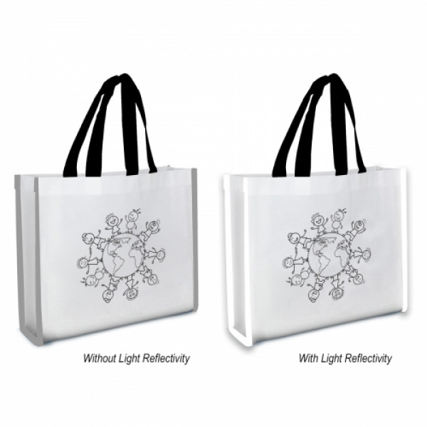 Create Your Custom Coloring Bag Design Or Choose From Our Stock Designs!::Made With Up To 20% Post-Industrial Recycled Material::Patented Reflective Piping Accents::15" Handles::Made Of 80 Gram Non-Woven, Coated Water-Resistant Polypropylene::Includes 6-Pack Of Crayons, Crayon Colors Include Blue, Brown, Green, Orange, Pink And Red::3 4/5" Gusset::Spot Clean/Air Dry