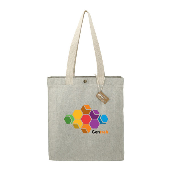 The Repose 10oz Recycled Cotton Box Tote w/Snap combines eco-conscious design with everyday functionality. Featuring a spacious main compartment and a secure snap closure, this tote is perfect for daily errands, trade shows, or eco-friendly promotions. Its boxy silhouette and contrasting cotton handles add a touch of modern style, making it an ideal customizable promotional product for brands looking to make a sustainable statement.