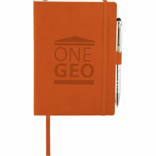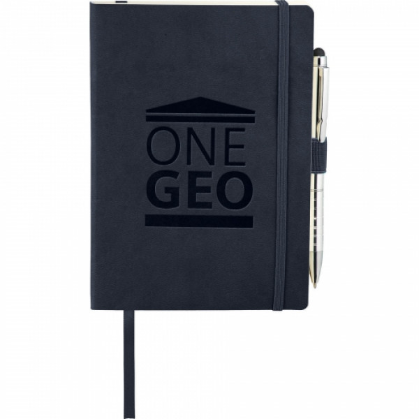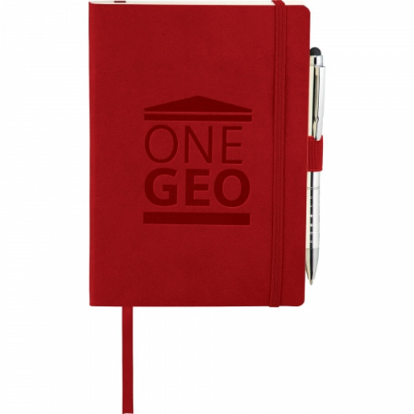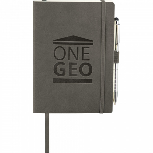 The 5" x 7" FSC® Mix Revello Soft Bound Journal features a flexible, soft cover with built-in elastic closure. This custom notebook includes a ribbon page marker to save your place. The Revello Soft Bound Journal includes a pen loop (pen is not included), document pocket on interior back cover, and includes 80 sheets of cream lined FSC® Mix paper.
