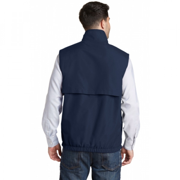 Two versatile looks for one great price! This reversible vest has a Taslan shell for wind and water resistance and a heavyweight fleece side to keep you warm.::100% polyester Taslan shell::100% polyester heavyweight fleece body lining::Front and back vents for easy decoration access::Front zippered pockets on Taslan side::Open pockets on fleece side::Elastic hem