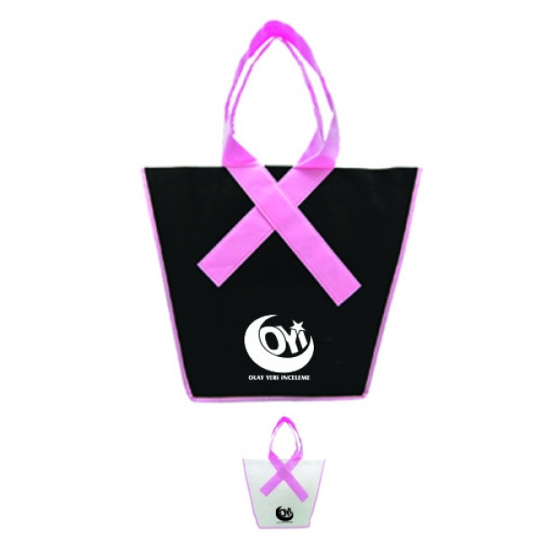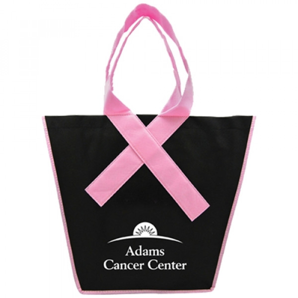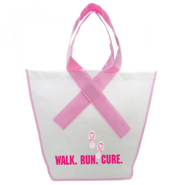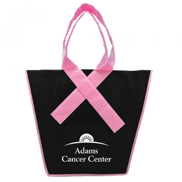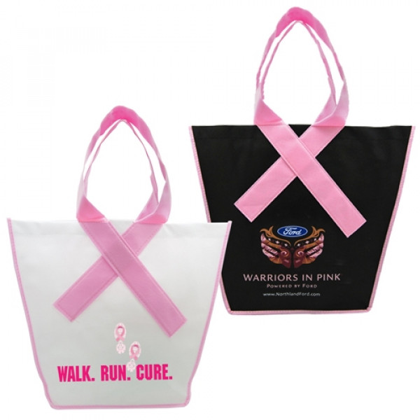 The Ribbon Tote is a great way to show your support for breast cancer awareness. The tote features patented awareness ribbon design handles and is reusable and hand washable. This item is part of the Awareness by Prime collection.