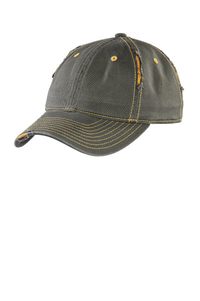 Torn seams. Contrast stitching. Just what you need for edgy cool.::100% cotton twill::Unstructured::Low profile::Hook and loop closure::Due to a special finishing process, distress and color may vary.
