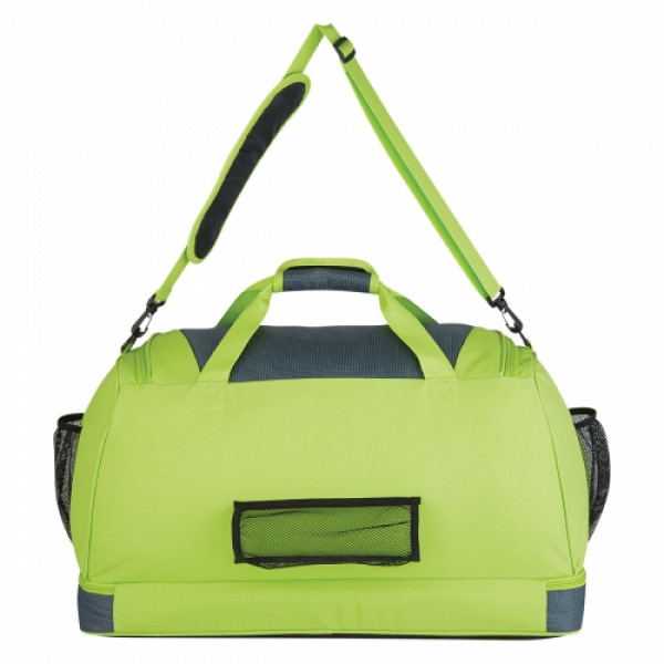 ::Made Of Combo: 600D Polyester, PVC And 420D Polyester Dobby::Detachable/Adjustable Padded Shoulder Strap And Web Carrying Handles With Hook And Loop Closure Comfort Grip::Top Double Zippered Main Compartment::Double Zippered Drop-Bottom Compartment::Front Zippered Shoe Compartment With Air Vents And Outside Zippered Pocket::2 Side Mesh Pockets::Mesh Holder On Back::Spot Clean/Air Dry