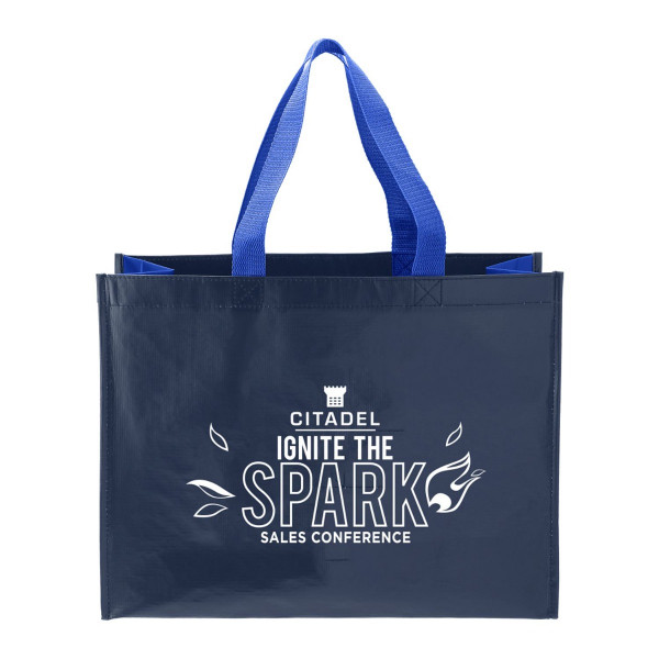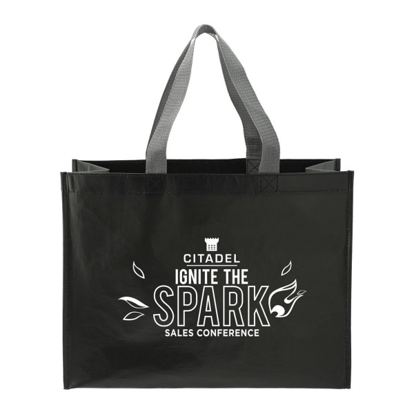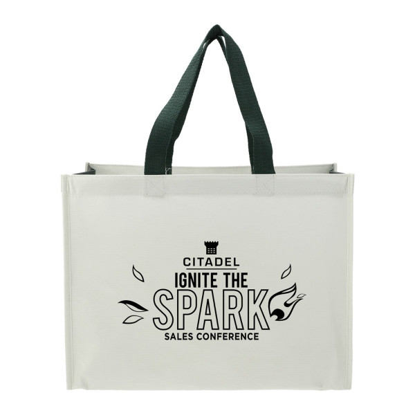 The RPET Laminated Matte Non-Woven Shopper Tote features a retail-inspired design with a soft RPET spun bond non-woven main material.