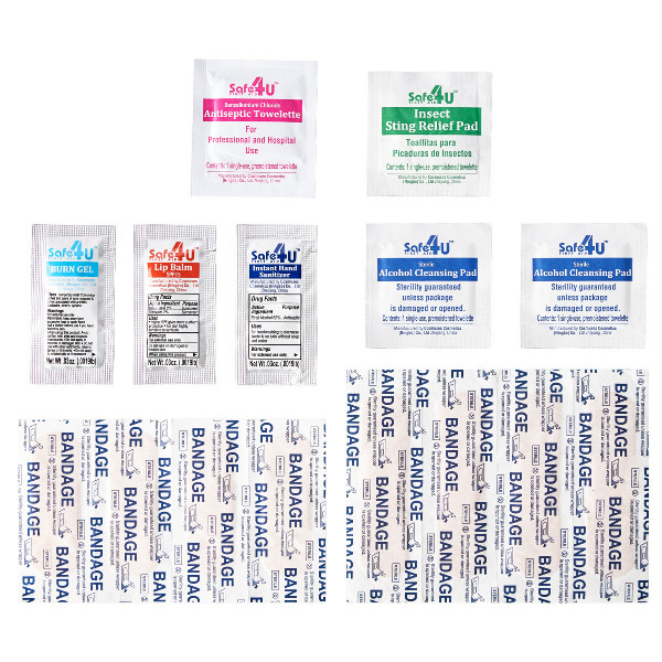Kit Includes 4 Short Adhesive Bandages, 4 Large Adhesive Bandages, 2 Alcohol Wipes And 1 Each Antiseptic Towelette, Insect Sting Relief Pad, Burn Gel, SPF 15 Lip Balm And Instant Hand Sanitizer