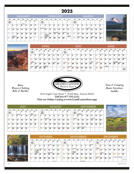 Four beautiful scenic photographs grace this quarterly format. The large center imprint area allows for an ad with impact.