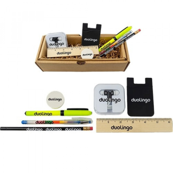 - The Scholar kit includes: EARBUDDY earbuds, F6N 6" ruler, RAINBO gel pen, BWPENCIL, HYENA highlighter, RE92 eraser and SW smart wallet, all cradled inside a kraft paper mailer box on a bed of crinkle paper.