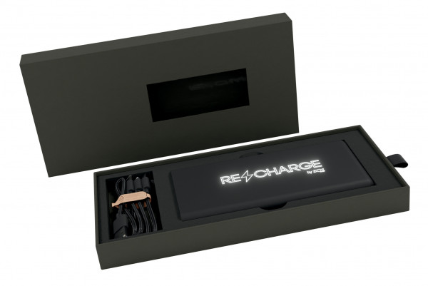 Power up your devices with this 10,000 mAh jumbo capacity wireless power bank. It features a soft-touch rubber finish with a light-up logo that illuminates with a slight shake of the power bank. Includes a 3-in-1 RPET charging cable, premium gift box, and 3-year warranty. Patent pending.