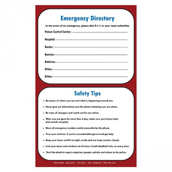 - Includes safety tips and a section for emergency phone numbers