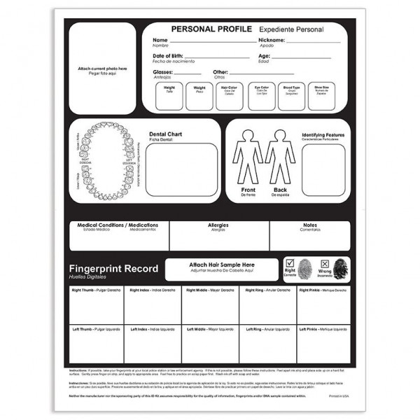 - Recordkeeping sections for photo, identifying features, dental record, medical conditions, and full fingerprint record