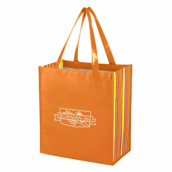 ::Made Of 80 Gram Laminated Non-Woven, Coated Water-Resistant Polypropylene::Great For Grocery Stores, Markets, Book Stores, Gift Bags, Etc.::8" Striped Side Gusset::Reusable::Recyclable::21" Handles::Spot Clean/Air Dry