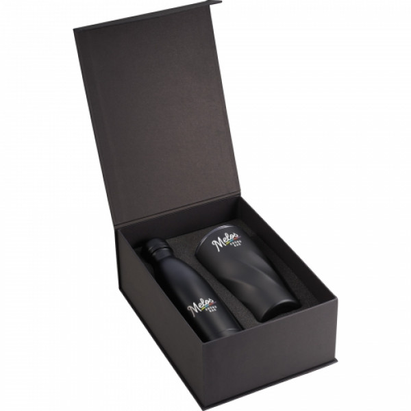 ::Do not miss out on one of the best gift sets of the year. ::Includes 17oz Copper bottle and 20oz Hugo Tumbler. ::Durable, double-wall stainless steel vacuum construction with copper insulation, which allows your cold beverage to stay cold for 24 hours and at least 8 hours for hot beverages. ::The construction also prevents condensation on the outside of the piece. ::Gift box is not decorated. ::There might be tiny color variance across the components in a set.