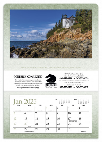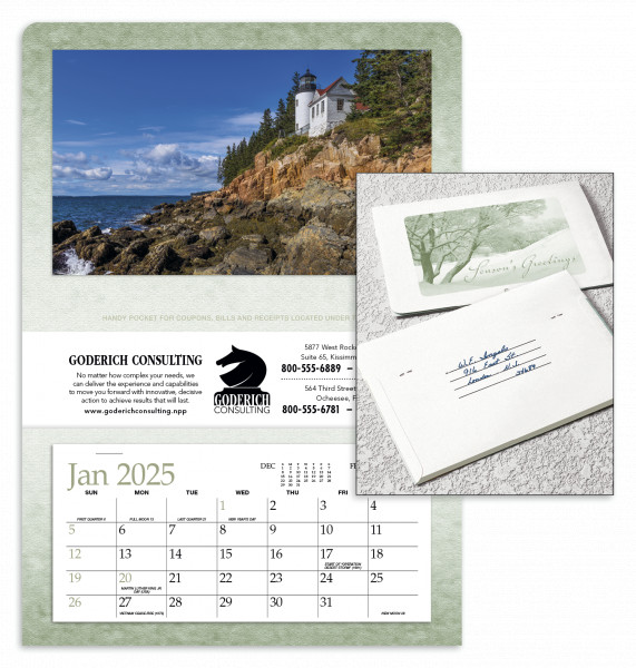 Great value and great versatility! This calendar folds for convenient distribution as a self-mailer and stores easily in a filing cabinet when the year is over. The single pocket is ideal for bills and memos.