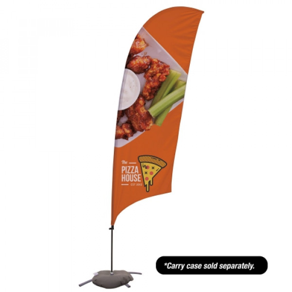 Value sail signs are perfect for large-quantity orders and short-term use.::Due to its feather-like shape, the razor flag style is sometimes called a feather flag::Artwork is dye sublimated on super poly knit fabric::A loop attached to the flag connects to an adjustable hook on the pole::Carbon composite poles are strong and flexible::Channeled carbon composite overlay pole construction with a low-gloss black paint finish::Pole segments have double-reinforced carbon fiber ends::Bottom pole segment is 53.25", middle pole is 41.5", and top pole segment is 53"::Cross base is constructed of steel::Included ballast can be filled with water to keep the unit weighted down::Carry case sold separately