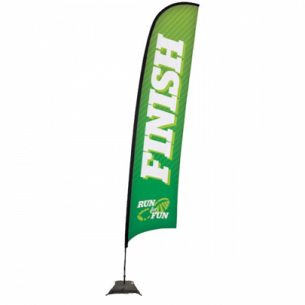 Sail signs are built to move in the wind, making them truly hard to miss. Premium flags are reinforced with black pole pockets constructed of a high tensile elastic polyester binding.::Due to its feather-like shape, the razor flag style is sometimes called a feather flag::Artwork is dye sublimated on super poly knit fabric::Flag is reinforced with high tensile strength elastic polyester binding to create a stylish black outline around the edge of the flag::Flag attaches to a fixed hook on the pole using the included bungee tie kit::Carbon composite poles are strong and flexible::Uniform carbon composite overlay pole construction with high-gloss black paint finish::Polished aluminum collar pole segment ends and ergonomic, rubber-reinforced base grip::Steel scissor base is great for use on hard, flat surfaces both indoors and out::Included ballast can be filled with water to keep the unit weighted down::High tensile strength elastic polyester binding