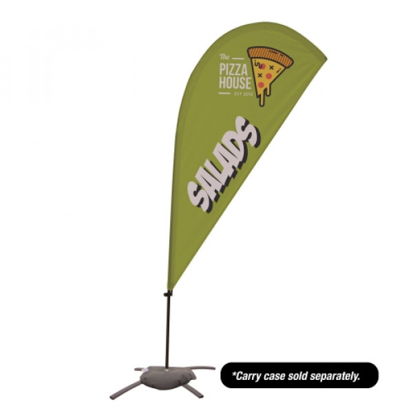 Value sail signs are perfect for large-quantity orders and short-term use.::Classic teardrop shape::Artwork is dye sublimated on super poly knit fabric::A loop attached to the flag connects to an adjustable hook on the pole::Carbon composite poles are strong and flexible::Channeled carbon composite overlay pole construction with a low-gloss black paint finish::Pole segments have double-reinforced carbon fiber ends::Top pole segment is 53", and bottom pole segment is 53.25"::Cross base is constructed of steel::Included ballast can be filled with water to keep the unit weighted down::Carry case sold separately