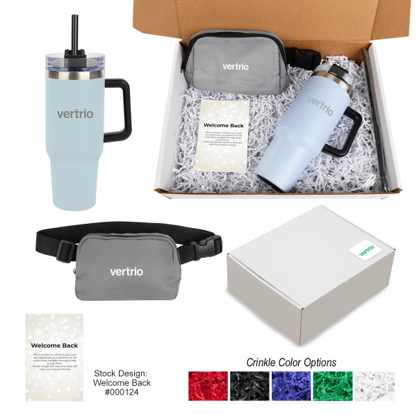 Create a memorable and practical gift with this custom promotional set featuring two best-selling items: the Anywhere Belt Bag and the 40 oz. Intrepid Stainless Steel Tumbler. Perfect for wellness programs, employee appreciation, or client giveaways, this set comes packaged in a mailer box with crinkle stuffing, a customizable insert card, and a box label for a complete branded experience. Personalize each item with a 1-color imprint and make a lasting impression.