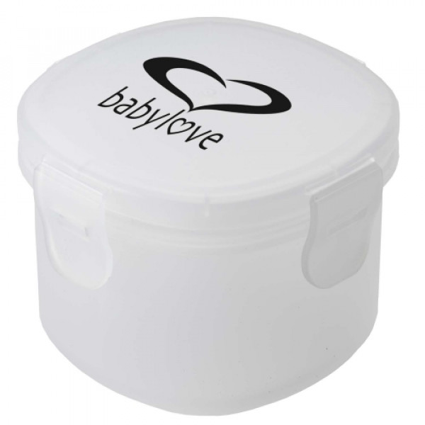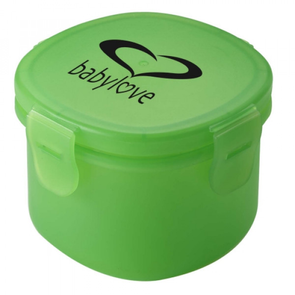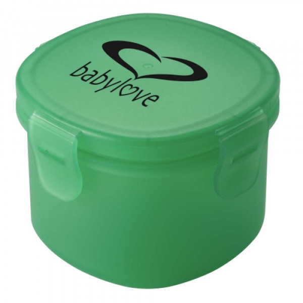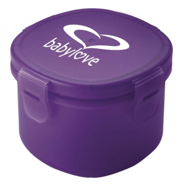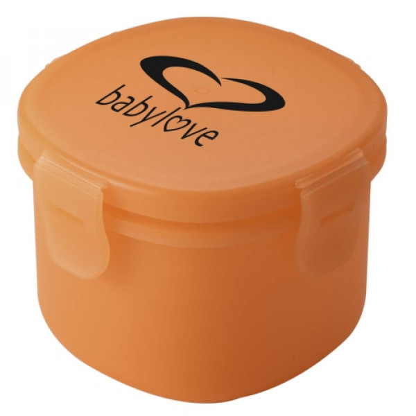 ::Food grade polypropylene snack container holds one cup::Features flip-down snap closure lid::Top rack dishwasher safe::Microwave safe