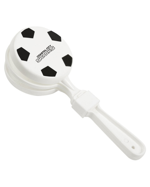 - Soccer-shaped plastic clappers featuring sport-themed stock art