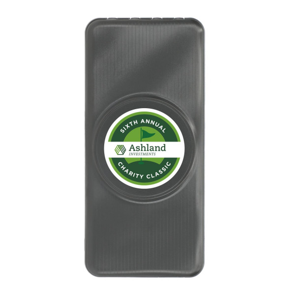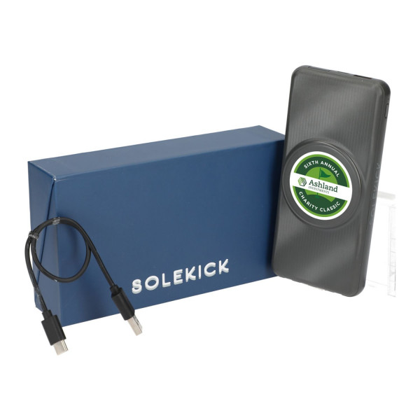 Introducing the Solekick™ MagClick™ 10000 15W Wireless Power Bank - a 10,000 mAh/37Wh rechargeable lithium polymer battery that works as both a wireless charging pad and a regular power bank. It magnetically attaches iPhone 12/13/14 models for wireless charging. Supports up to 15W for Android and 7.5W for iOS phones. Features an LED display to show the remaining battery capacity percentage and integrated cables with USB-A input tip, micro output tip, Type C output tip, and 2-in-1 output tip for all difference kinds of electronic devices. USB-A Output: 5V/3A; 9V/2A; 12V/1.5A. Type C Input/Output: 5V/3A; 9V/2.22A; 12V/1.67A. Works with most plastic phone cases on. Comes with a 31-inch USB-A-to-Type-C charging cable and packaged in a FSC certified premium gift box. Note: power banks are permitted in carry-on luggage only, and at the discretion of TSA agents. Charge before initial use.