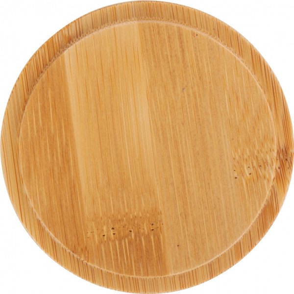 - Includes bamboo coaster that doubles as a lid