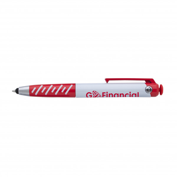 The Souvenir® Fidgeteer Stylus Pen is a versatile writing tool designed to boost creativity and relieve stress. Featuring a playful joystick on top, this pen is perfect for keeping your hands busy without distraction. The pen's sleek design includes a comfortable rubber grip and stylish barrel accents.