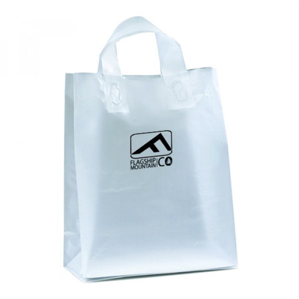 Hi-density 10" frosted plastic ink imprint shopping bag with side and bottom gussets, fused loop handles and cardboard bottom insert. 3.0 mil thick. ::One color imprint recommended. Please call for information on multiple color imprint options.